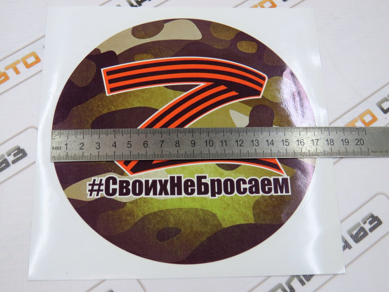 Виниловая наклейка с рисунком Z на фоне цвета Хаки и надписью "Своих не бросаем" на белом фоне. Наклейка круглая, диаметр 18см.
