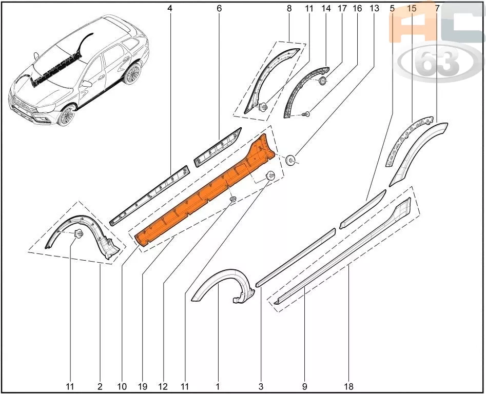 Правый штатный обтекатель порога для автомобилей Лада Веста Cross (седан и универсал). Обтекатель является деталью штатного кросс-обвеса Весты.