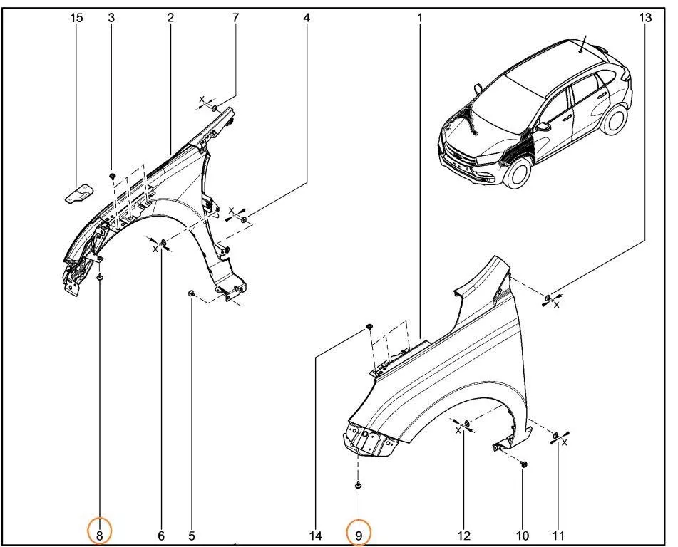 Болт М6х1х20 для автомобилей Лада Веста и Хрей. Используется для крепления фар головного света в автомобилях Лада Веста (нижнее крепление) и для крепления крыла Лада Хрей (на схеме).
