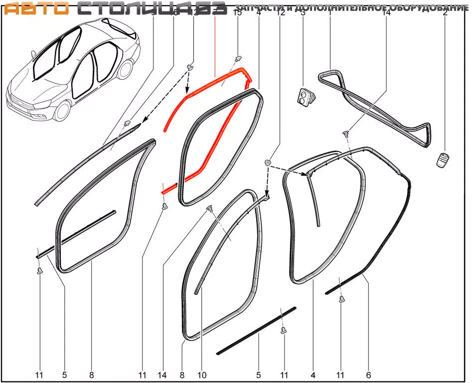 Оригинальный уплотнитель проема задней правой двери верхний в сборе для автомобиля Лада Веста седан (в том числе седан Кросс). Не подойдет для Весты универсал (SW и SW Cross).