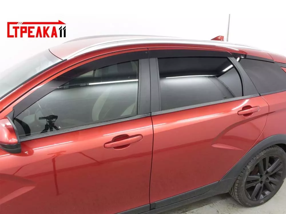 Плоские 2D ветровики боковых стекол для автомобилей Лада Веста в кузове универсал (SW и SW Cross).В комплекте 6 ветровиков (передние и задние двери, уголки над форточками). Цвет черный, полупрозрачный.