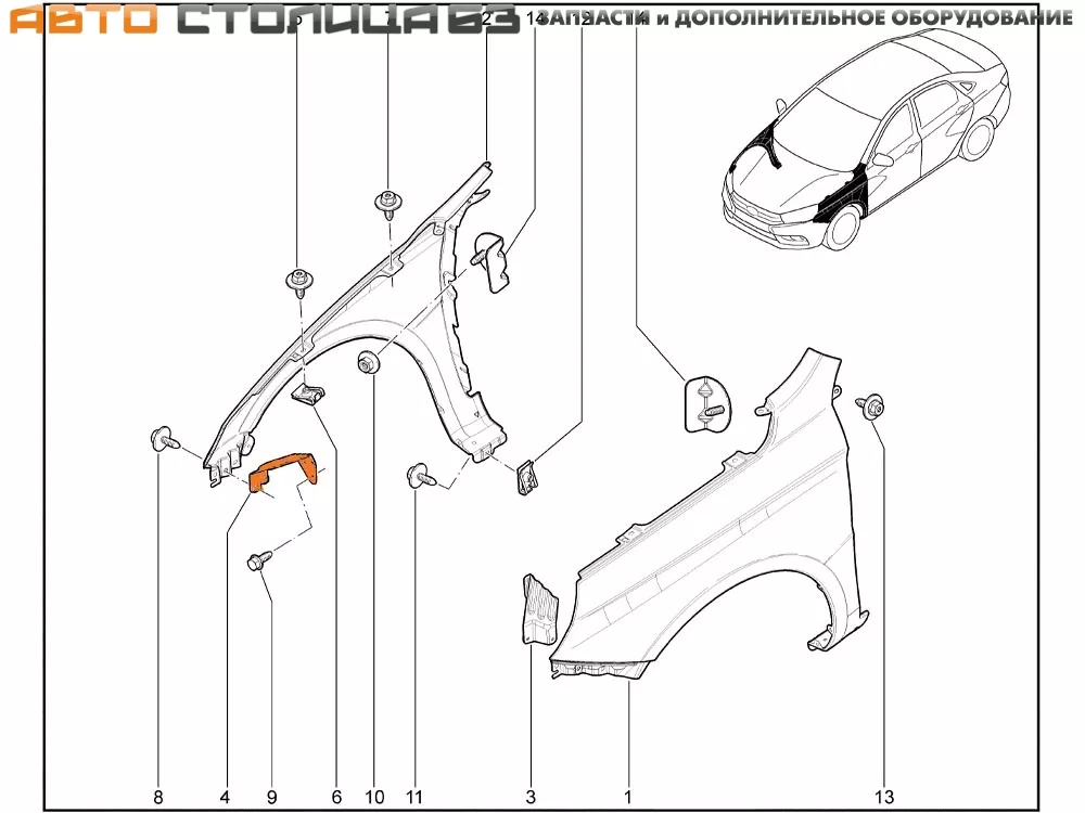 Оригинальный заводской кронштейн крепления переднего крыла правый (со стороны пассажира) для автомобилей Лада Веста.