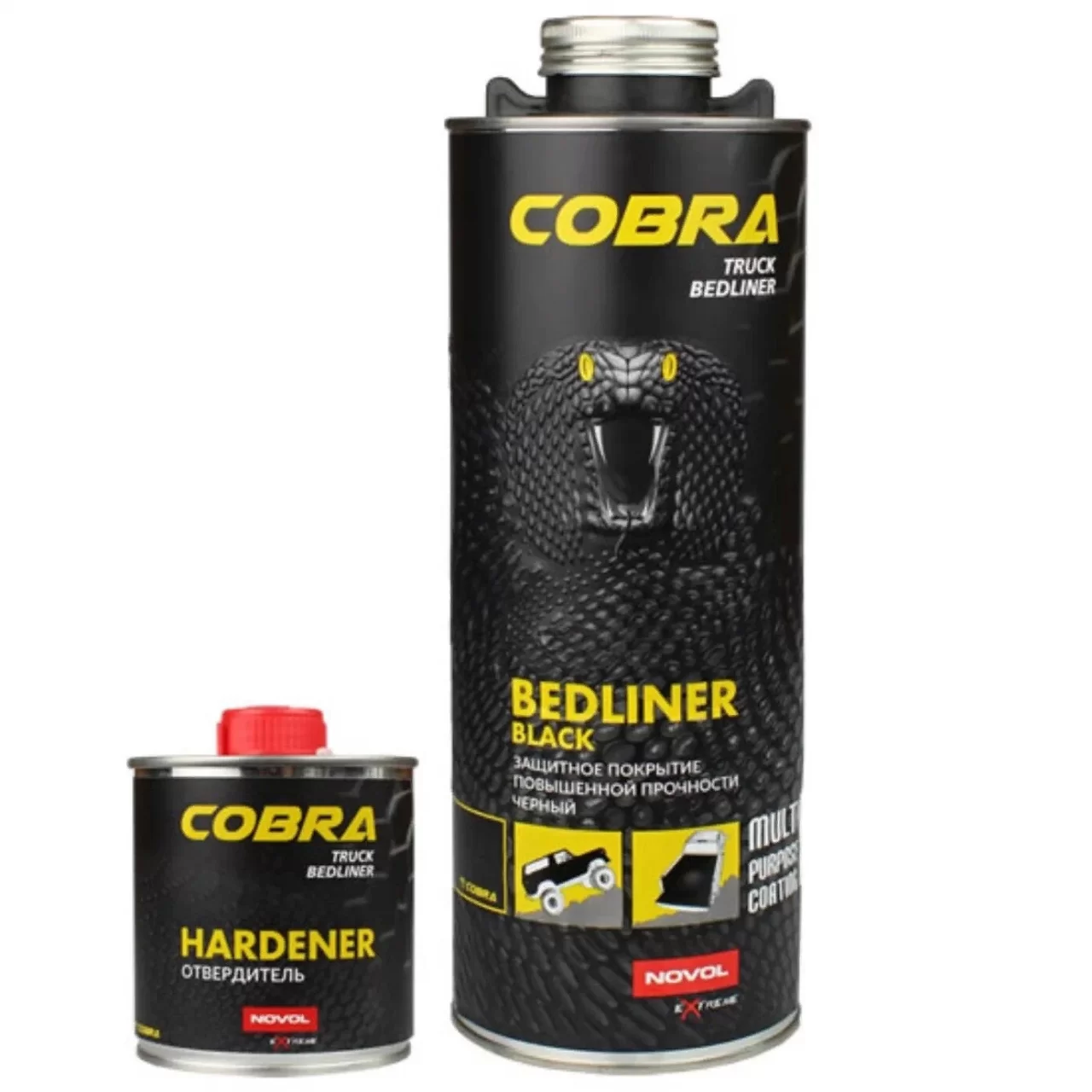 NOVOL COBRA Truck Bedliner - защитное покрытие со структурным эффектом на базе полиуретановых смол 2K. Отличается очень высокой механической прочностью и устойчивостью к царапинам. Защищает от влияния атмосферных факторов, бензина, масел, воды и соли. Обладает звукопоглощающими и глушащими свойствами. Структура поверхности придает противоскользящий эффект. В стандартном варианте производится черного цвета, в варианте под окраску позволяет получить любой цвет путем добавления 10-15% акриловой или базовой краски.