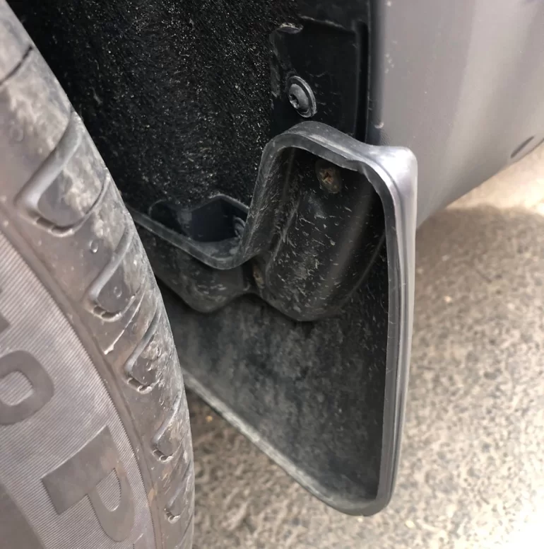 В зависимости от партии могут быть брызговики двух видов. На первых партиях установка брызговиков выполнятся на отдельные винты крепления как на фото: