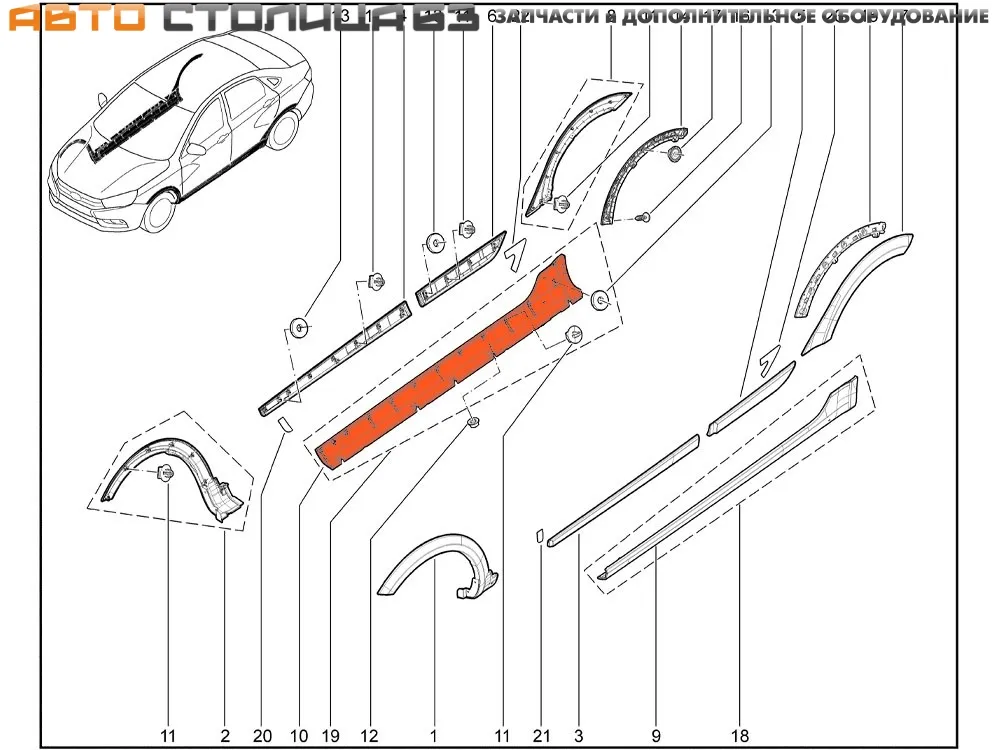 Правый оригинальный обтекатель порога для автомобилей Лада Веста Cross (седан и универсал). Обтекатель является деталью штатного кросс-обвеса Весты.
