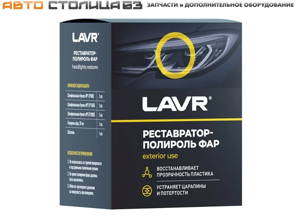 Реставратор фар LAVR – набор абразивных материалов и финишная паста для полировки пластиковых фар автомобилей. Средство возвращает прозрачность пластиковым фарам, удаляет царапины и помутнения, значительно увеличивает эффективность работы ламп. Особый состав обеспечивает продолжительный результат после полировки.