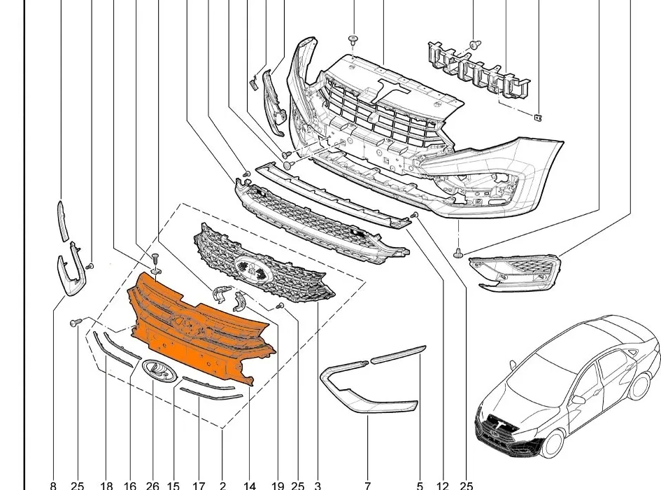 Оригинальная заводская решетка переднего бампера (радиатора) для автомобилей Лада Веста NG с 2022 года (седан, универсал). Не подойдет для Весты Кросс.