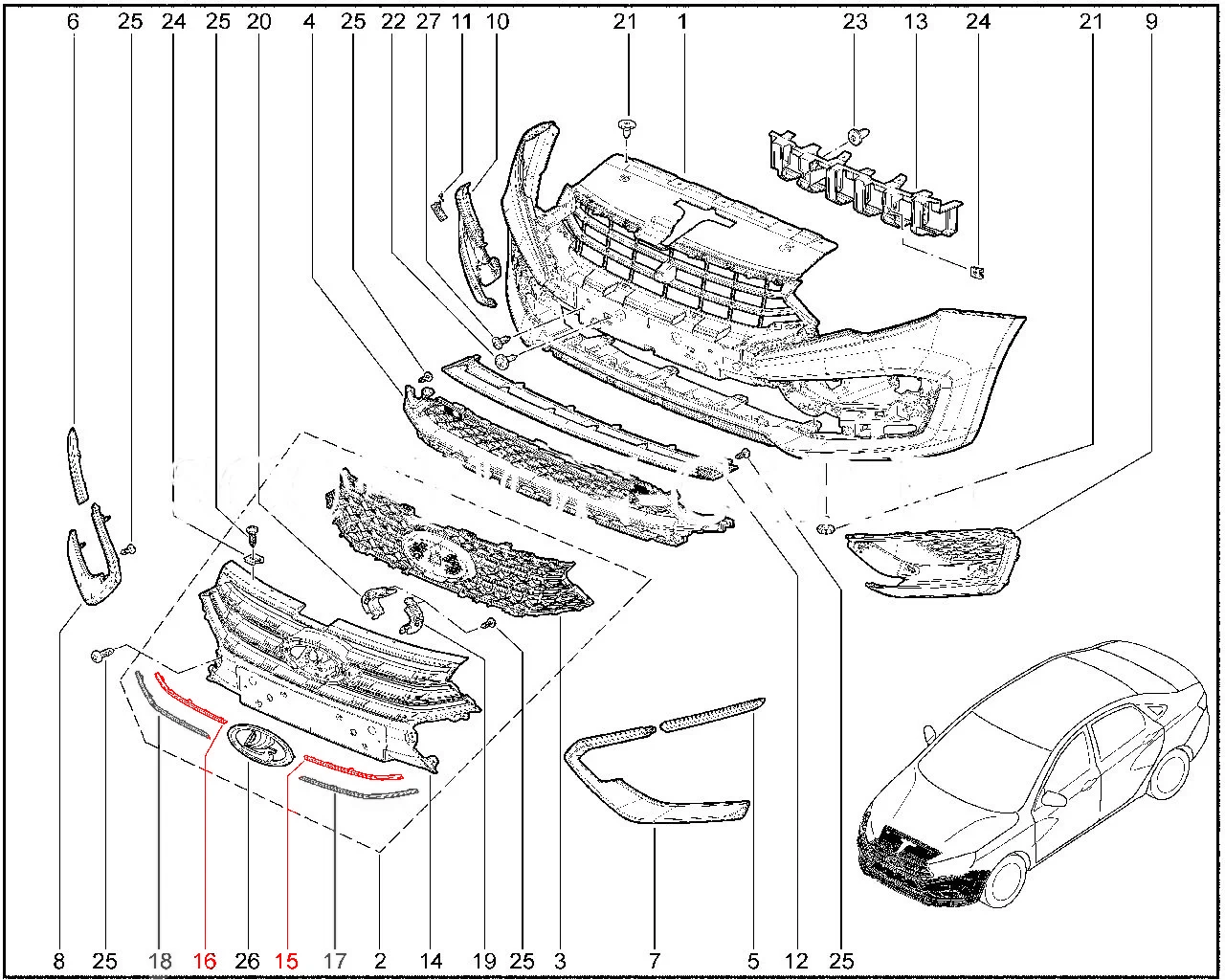Штатная оригинальная вставка накладки переднего бампера верхняя для Lada Vesta NG.
