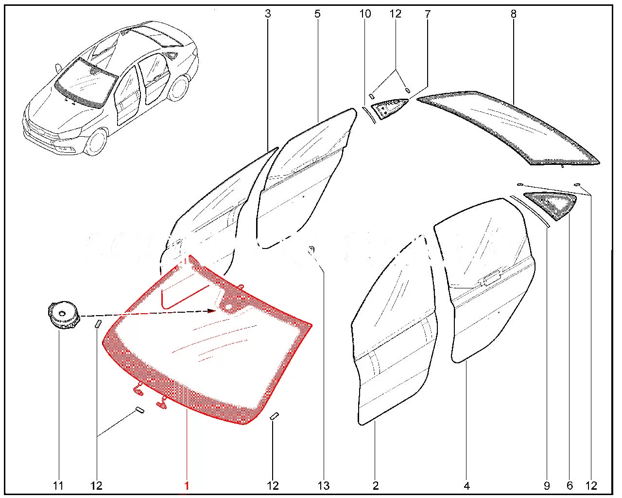 Штатное оригинальное стекло ветрового окна с пластиной и ДД ЭО для Lada Vesta.
