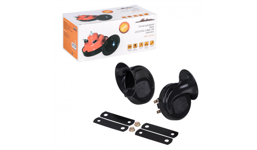 В комплекте 2 клаксона с частотой звучания 410Гц и 510Гц, величина звукового давления 118дб. Номинальное напряжение 12V.