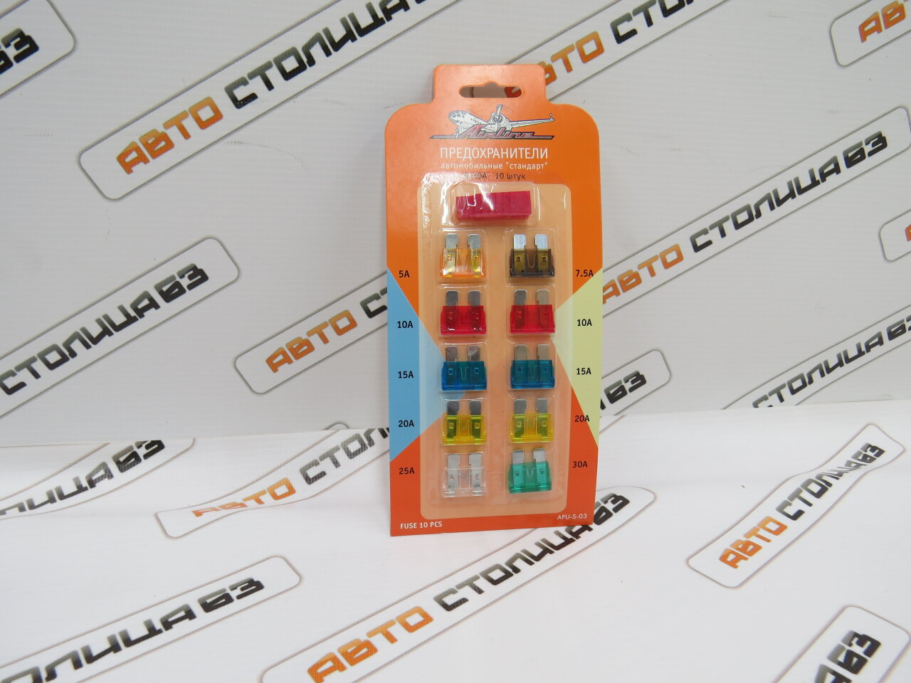 Набор предохранителей Standart (10 шт. 5-30А) от производителя AIRLINE разных номиналов.