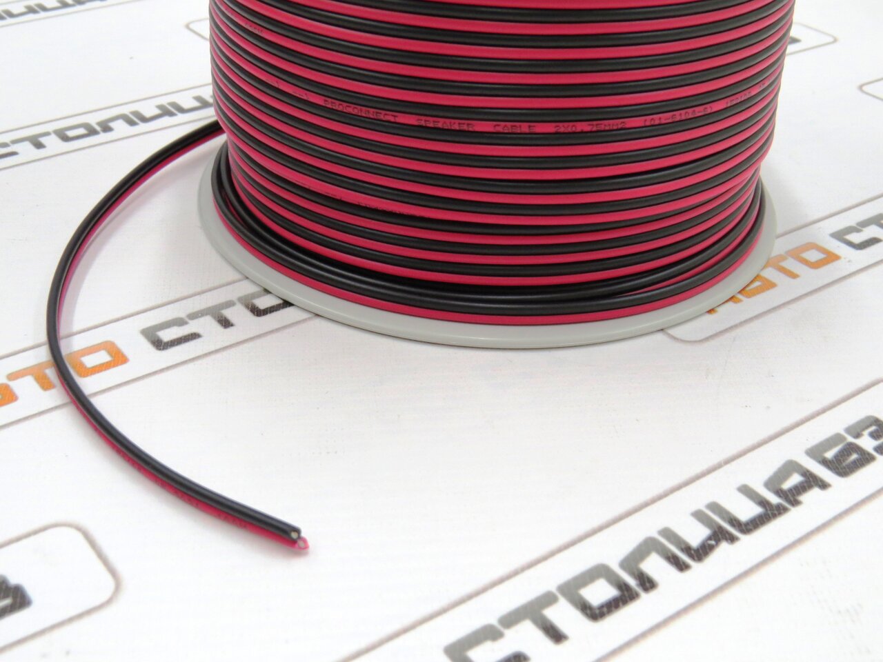 Акустический кабель для подключения звуковых систем. Кабель состоит из двух параллельных многожильных проводников, заключенных в изоляцию из поливинилхлоридного пластиката красного и черного цвета. Сечение провода 0,75кв.мм.