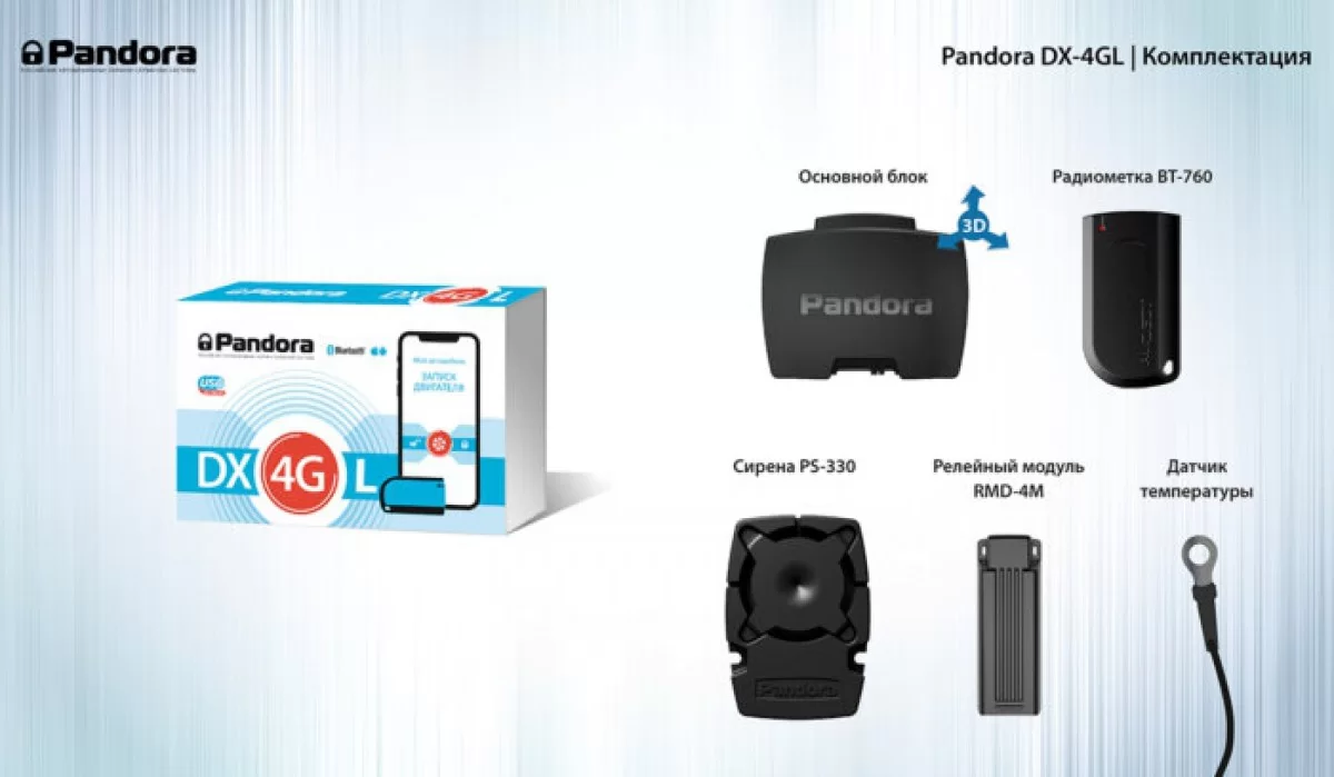 Автосигнализация Pandora DX-4GL является еще более доступной версией модели Pandora DX-4G: в ее комплектацию входит модуль запуск RMD-4 вместо RMD-5m, только одна метка BT-760, а также в ней используется другой 4G-модем, который не поддерживает 3G-связь.