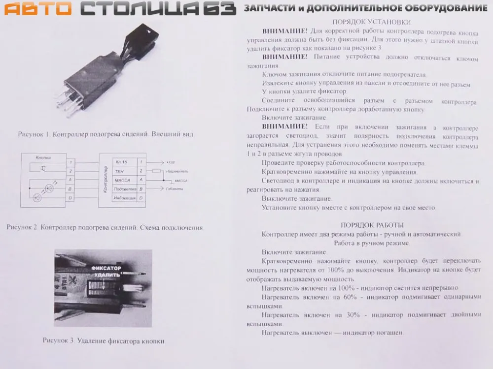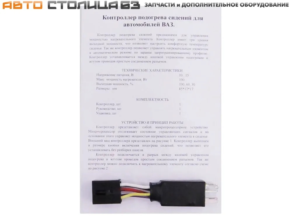 Контроллер подогрева сидений для автомобилей Лада. Предназначен для управления мощностью нагревательного элемента. Контроллер имеет три уровня выходной мощности, что позволяет настроить комфортную температуру сиденья. Так же контроллер позволяет управлять нагревательным элементом в автоматическом режиме по заранее запрограммированному профилю. Контроллер устанавливается между кнопкой управления подогревом и жгутом проводов простым соединением разъемов.