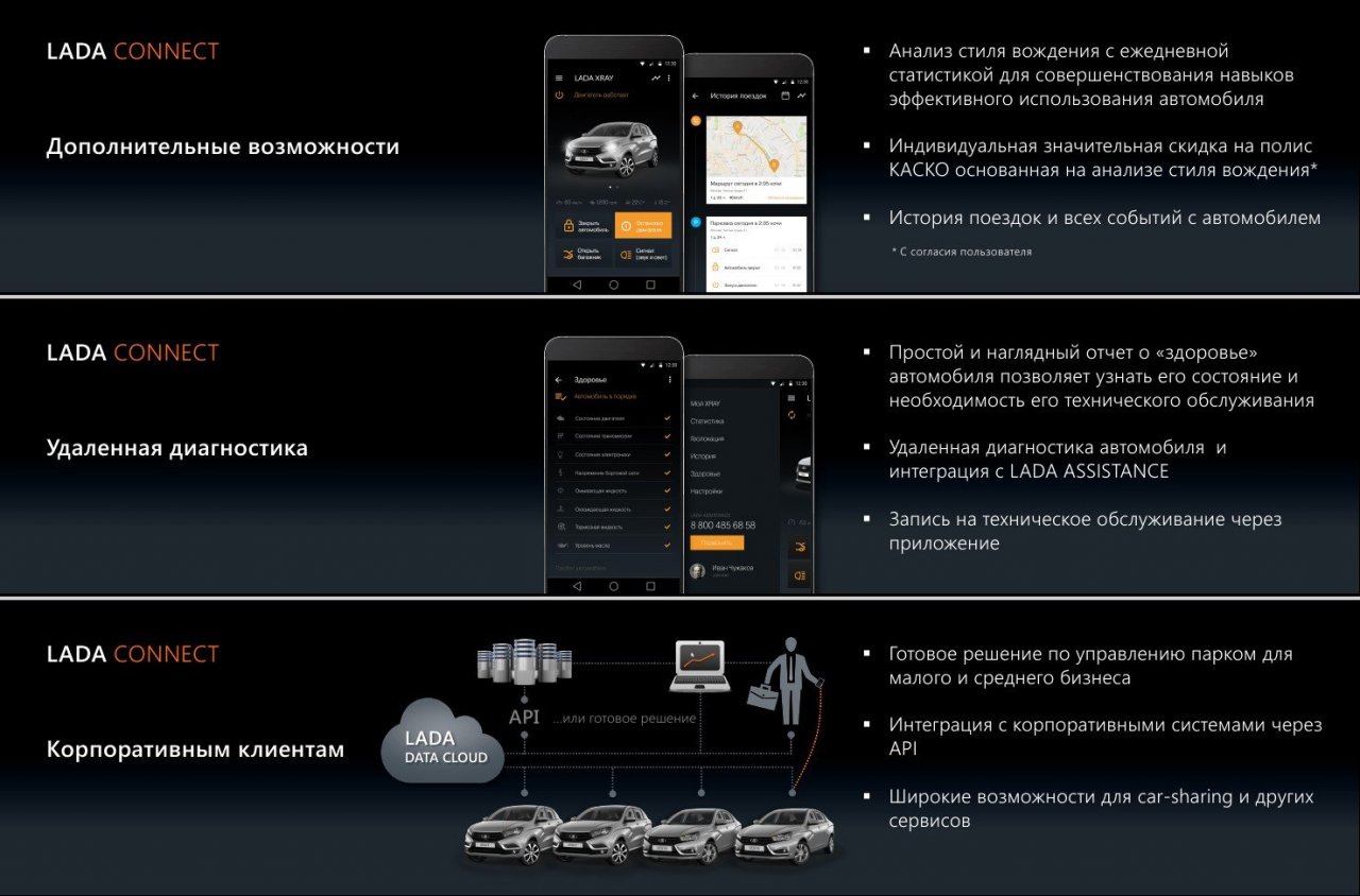 Система ЛАДА Connect ориентирована как на частного автовладельца, так и на корпоративных клиентов. По сути, это готовое решение по управлению парком для малого и среднего бизнеса, в котором возможна интеграция с корпоративными системами через API и предоставлены широкие возможности для car-sharing и других сервисов.