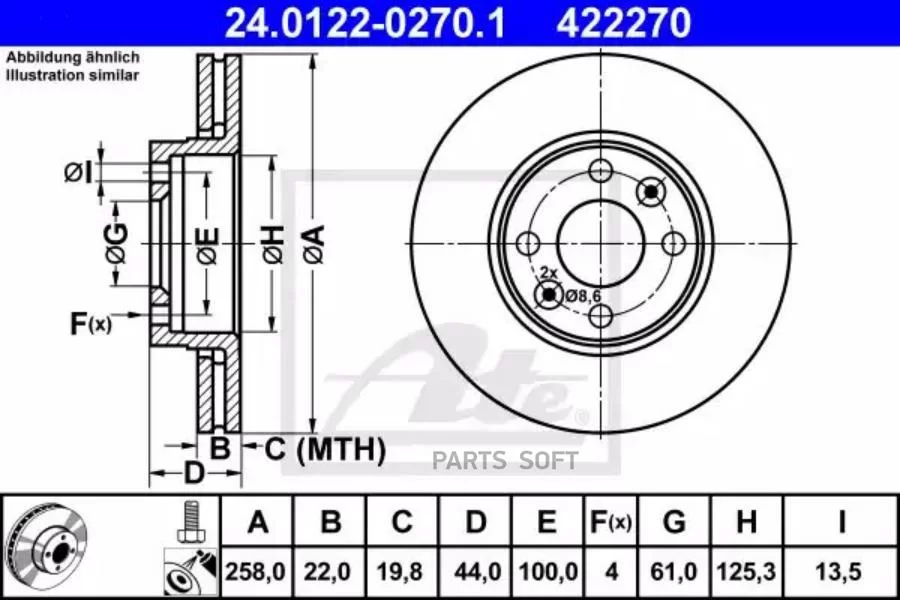Диск тормозной передний вентилируемый ATE 258x22 мм. 4 отверстия для автомобилей Лада Веста, Иксрей и Ларгус.