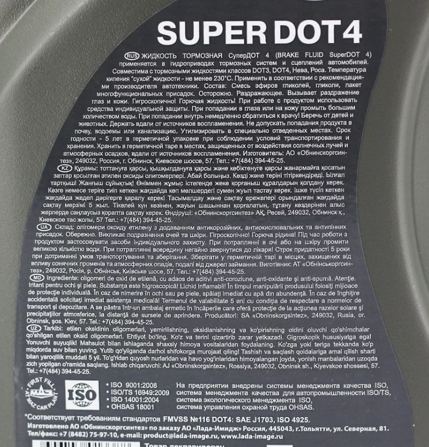 Жидкость тормозная LADA Super DOT-4 (1 л) LADA 88888100001082 Служит для использования в гидроприводах тормозов и сцепления, изготовлена конвейерным поставщиком ОАО "АВТОВАЗ". Соответствует требованиям DOT 4. Совместима со всеми тормозными жидкостями классов DOT 3, DOT 4, Нева, Роса. Комплекс присадок обеспечивает высокую температуру кипения (сухой жидкости 250С, увлажненной жидкости 155С), предохраняет тормозную жидкость от перегрева и сохраняет неизменными ее свойства. Комплекс антикоррозийных и антигигроскопичных присадок защищает тормозную систему от действия коррозии, а также нейтрализует влагу, попадающую в тормозную жидкость.