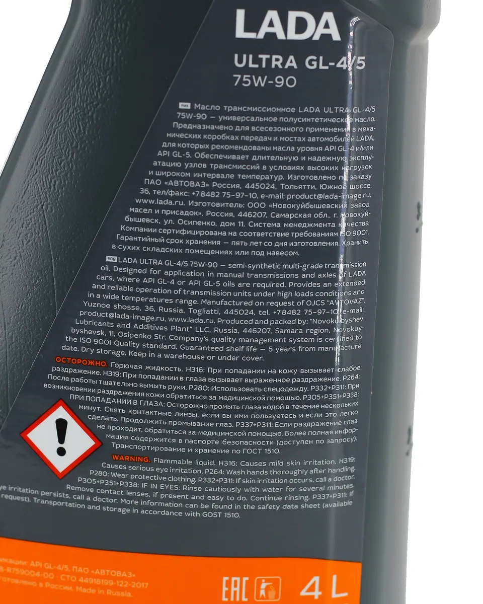 Трансмиссионное масло LADA Ultra полусинтетическое GL-4/5 75W90 - Универсальное всесезонное полусинтетическое трансмиссионное масло. Разработано для механических коробок передач и мостов легкового и грузового автотранспорта. Применяемость к конкретному автомобилю следует проверять по оригинальному каталогу запчастей.