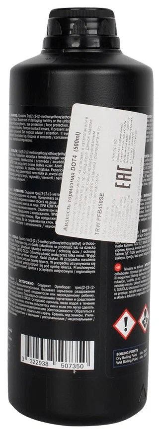 Тормозная жидкость TRW Dot 4 (500 мл) используется для надежной и бесперебойной работы тормозной системы. Работоспособная жидкость обеспечивает безопасное передвижение на автомобиле. Рекомендуемый интервал замены 1 раз в 30000 км пробега или 1 раз в 2 года эксплуатации.