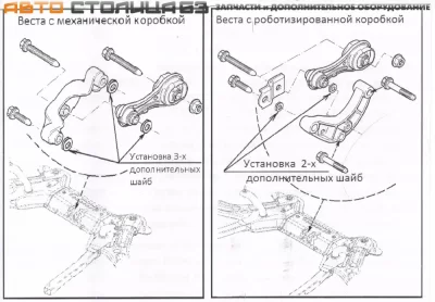 В комплект поставки входит опора и 3 проставочных шайбы (они предназначены для оптимального распределения нагрузки, на МКПП ставится 3 шайбы, на АМТ ставится 2 шайбы).