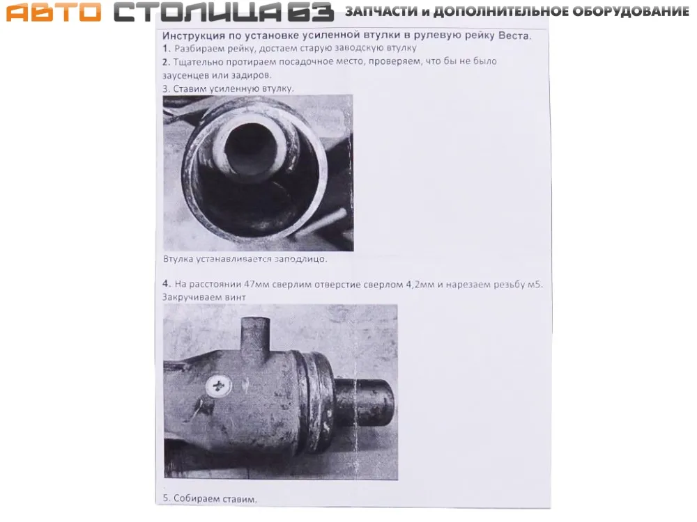 Комплект поставки включает: втулка рулевой рейки усиленная, смазка, фиксирующий винт, инструкция по установке.