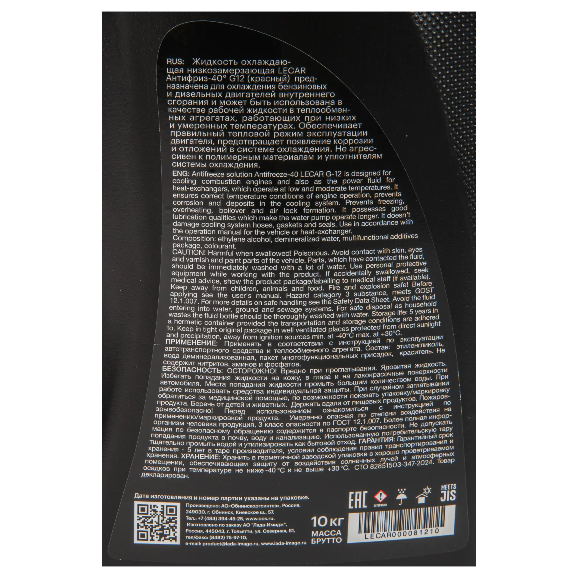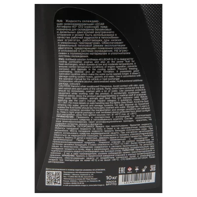 Антифриз LECAR G12 -40 (красный) — готовая к применению низкозамерзающая охлаждающая жидкость на основе органических ингибиторов коррозии OAT. Не содержит нитритов, нитратов, аминов, фосфатов, боратов и силикатов. Формула обеспечивает стабильный теплоотвод, защиту от коррозии и подходит для современных высокооборотистых и термонагруженных двигателей.