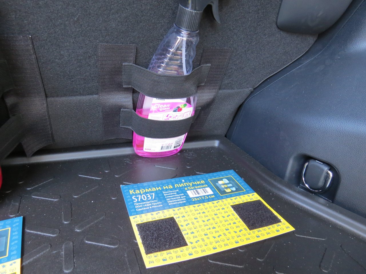 Карман - держатель на липучке для крепления различных предметов в багажнике автомобиля. Надежно крепится к ворсовой обивке багажника при помощи липучек. Поставляется в 3 размерах (необходимо выбрать при заказе):
