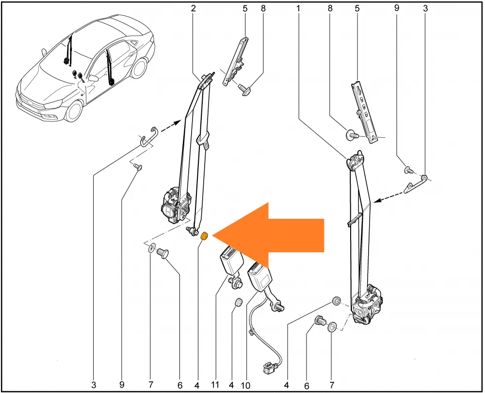 На автомобилях Лада Веста колпачок ставится штатно на передних ремнях (на схеме), на автомобилях Лада Гранта FL ставится штатно на передних и задних ремнях безопасности.