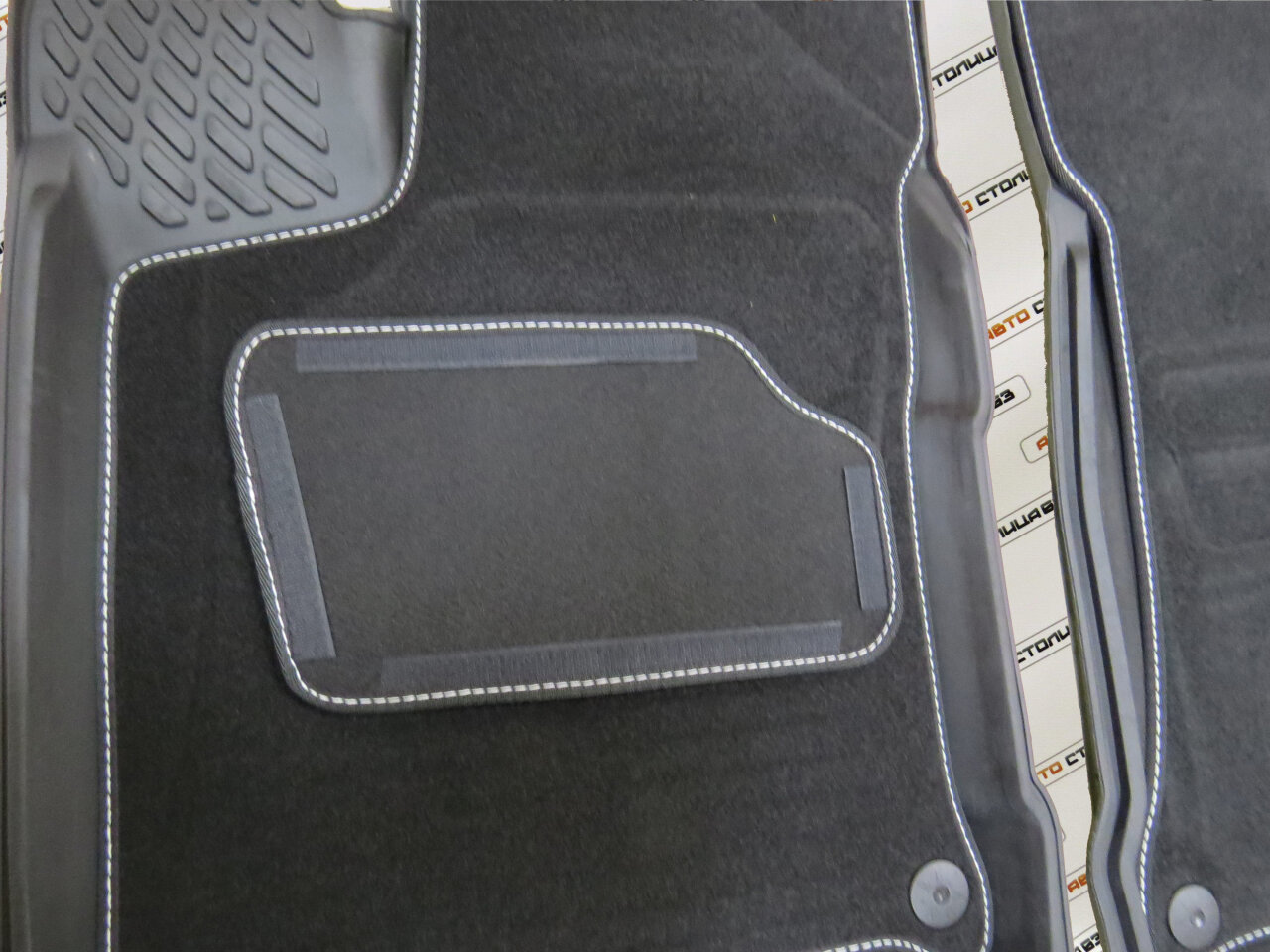 Коврики имеют свой собственный подпятник, он выполнен из того же материала, что и ворсовые ковры и крепится на липучках, что позволяет расположить его в удобном месте.