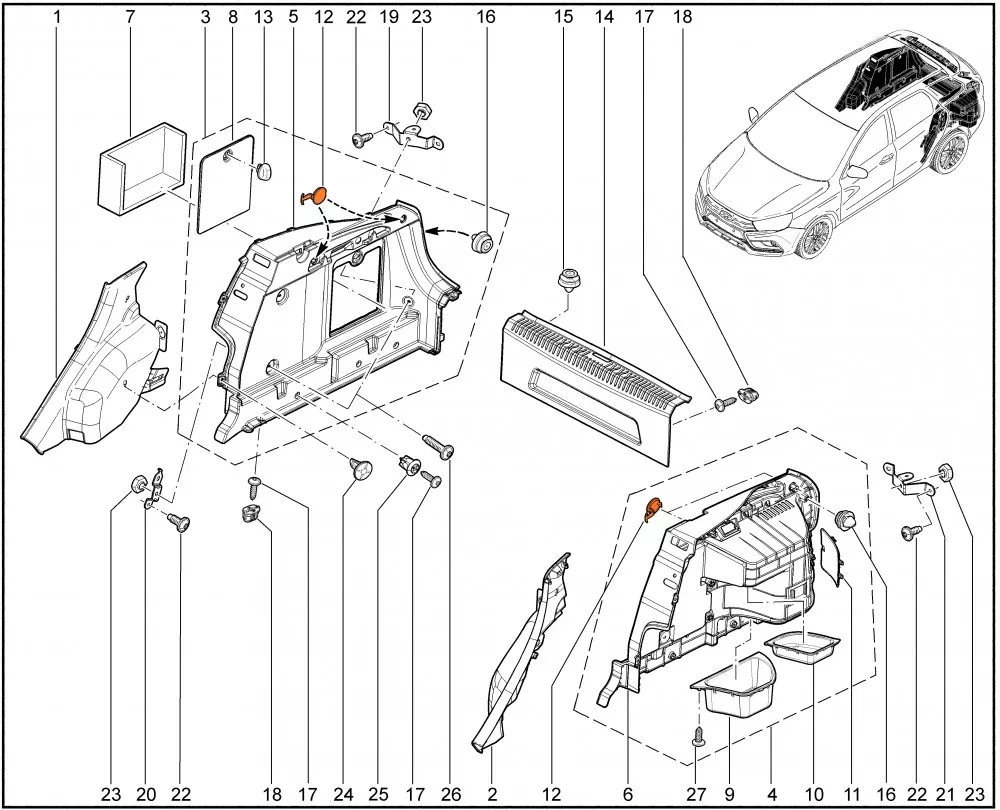 Оригинальная заглушка обивки задней арки и боковины верхняя для автомобиля Лада Веста универсал (СВ и СВ Кросс).