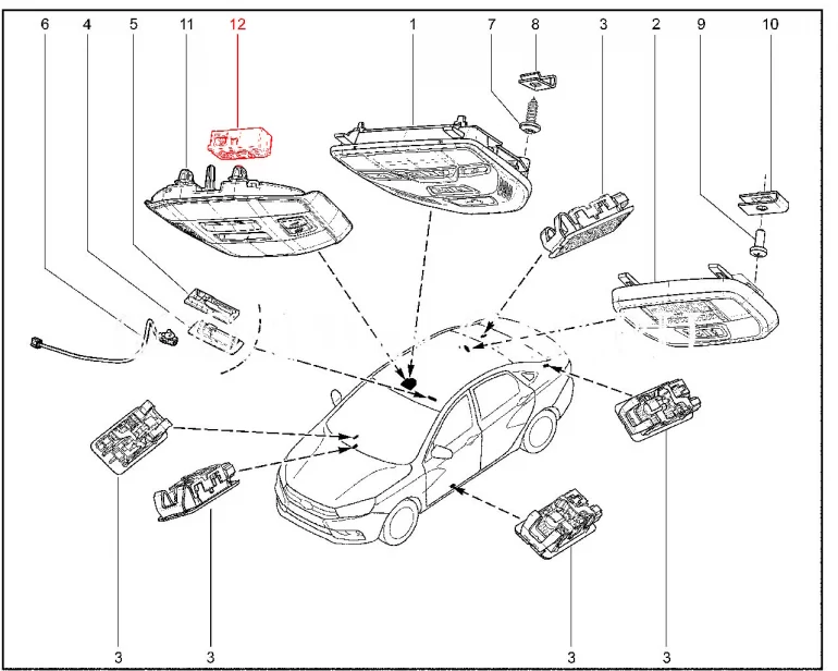 Штатный серый блок освещения салона без отсека для очков для нового поколения Лада Веста.
