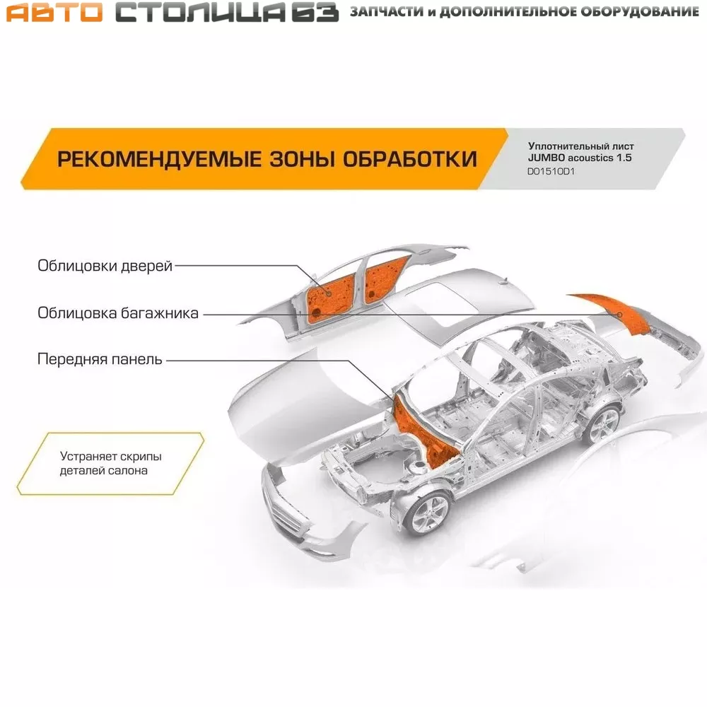 Уплотнительные листы JUMBO acoustics 1.5 – прокладочный уплотнительный материал на основе нетканого полотна, служащий для устранения скрипов панелей салона. Шумоизоляция авто с помощью материалов JUMBO acoustics снижает шум и вибрации в салоне и создает тихую среду для комфортных поездок.