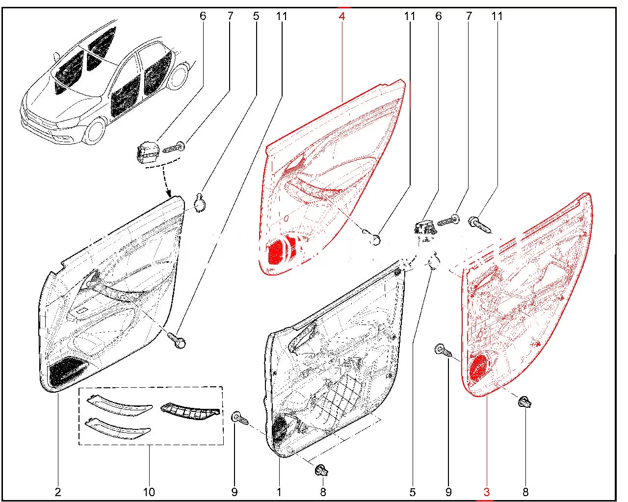 Штатная обивка задней двери с кнопками в сборе для Лада Веста.