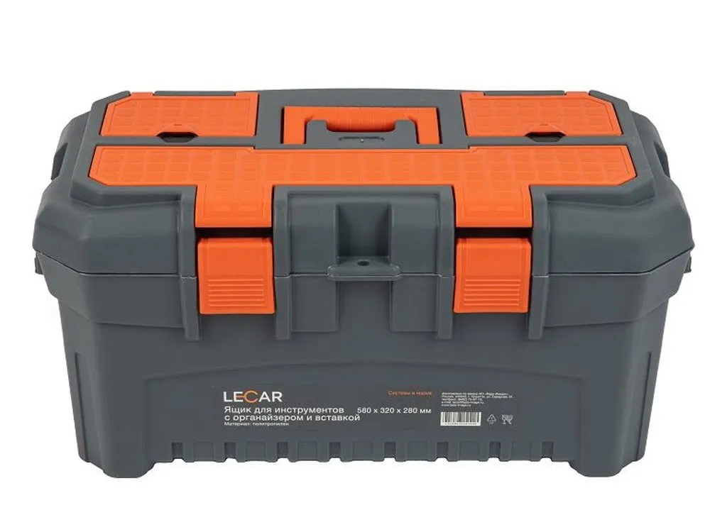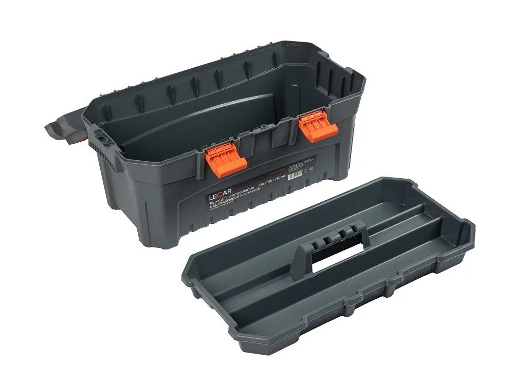Ящик для инструментов с накидными замками, рассчитанными на повышенные нагрузки. Крышка ящика оснащена органайзерами для хранения мелочей. На корпусе имеются отверстия для крепления наплечного ремня. Возможность использования навесного замка защитит содержимое от свободного доступа, в том числе обеспечит безопасность детей. Наличие съемного внутренного лотка.