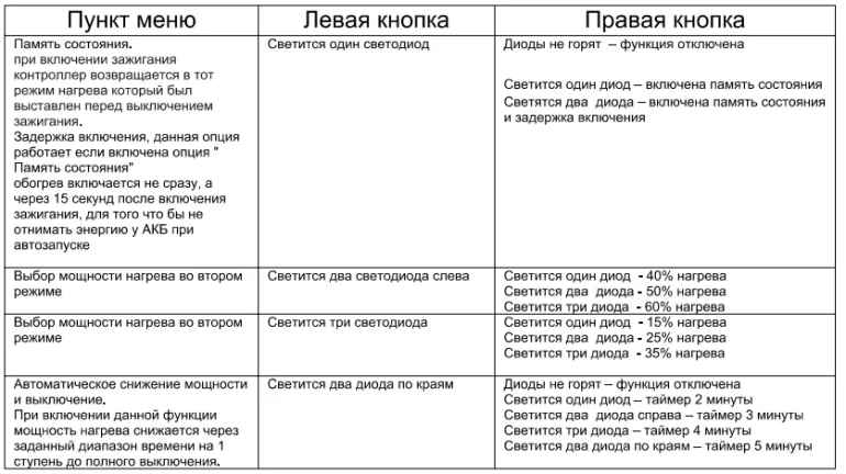 Переключение режимов нагрева осуществляется короткими нажатиями на кнопку соответствующего сиденья.