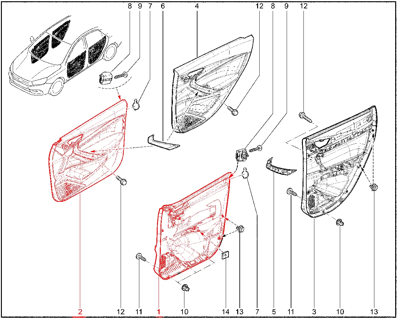 Штатная оригинальная обивка передней двери в сборе для Lada Aura.