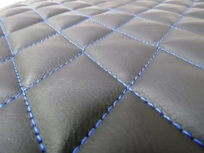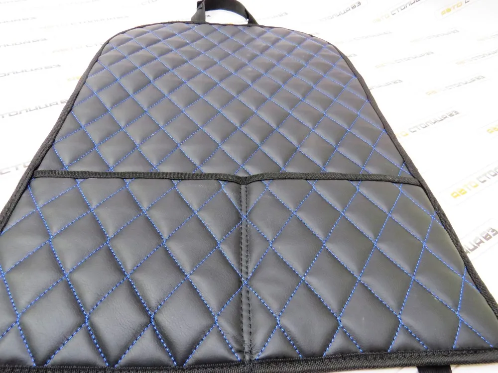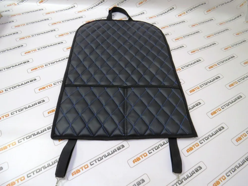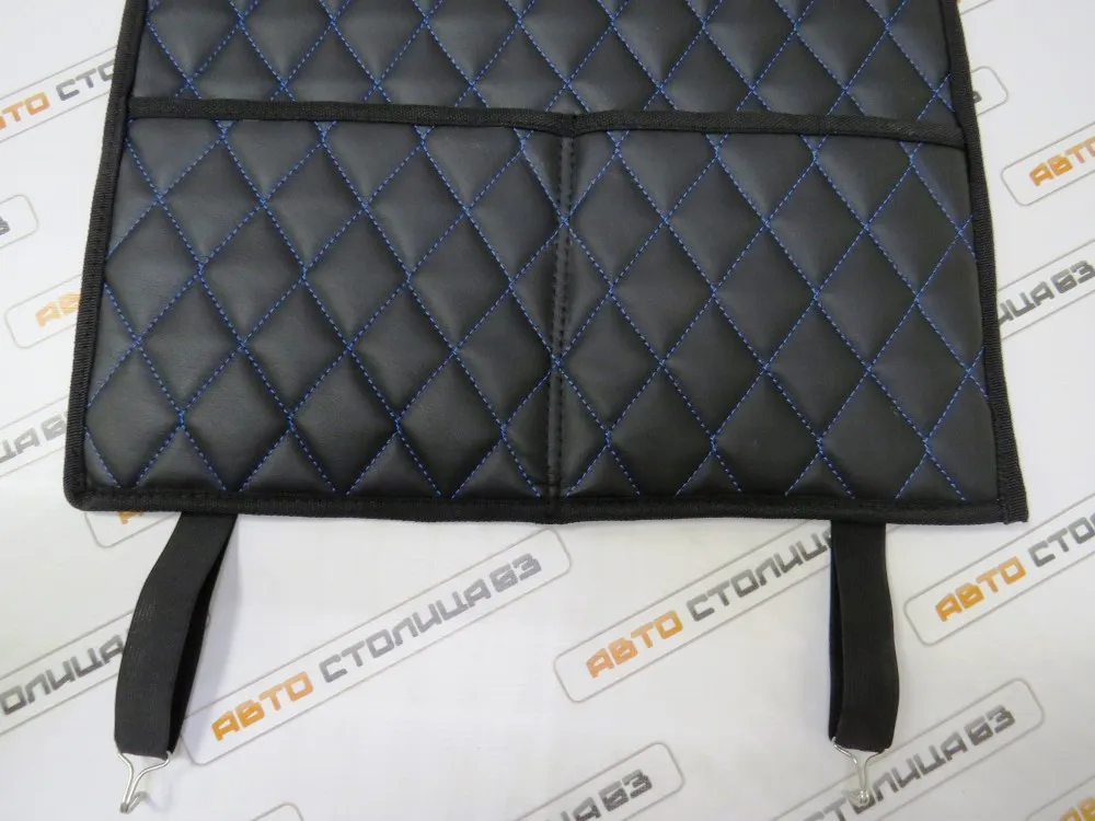 Защитная накидка на сиденье с карманами из экокожи (черная экокожа, синяя нить, прострочка Ромб) от производителя ArmAuto.