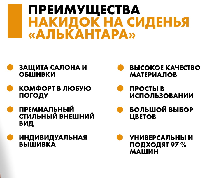 Накидки полностью закрывают нижнюю часть сиденья (сидушку), защищая её от преждевременного износа, а также повреждений и загрязнений. При этом выглядит в салоне очень эстетично и привлекательно, делая салон более стильным и индивидуальным.