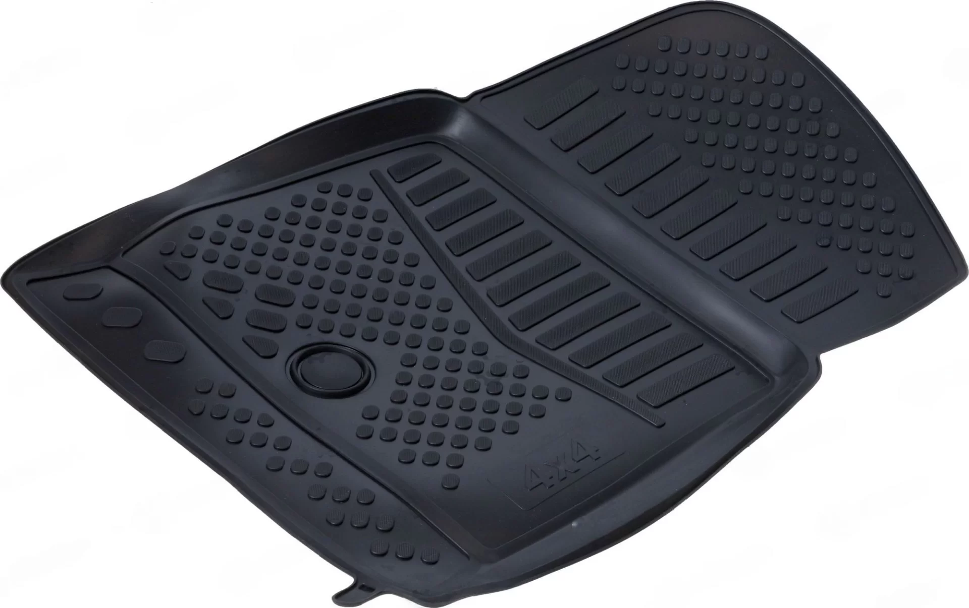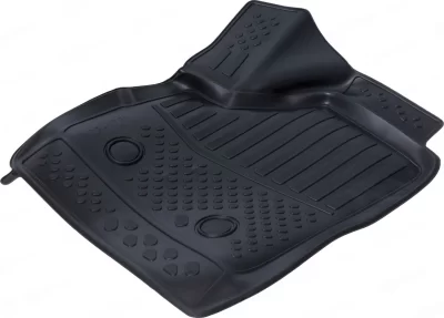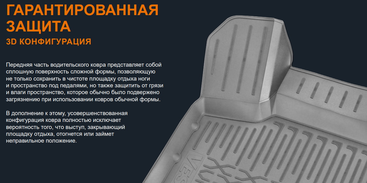 Передняя часть водительского ковра представляет собой сплошную поверхность сложной формы, позволяющую не только сохранить в чистоте площадку отдыха ноги и пространство под педалями, но также защитить от грязи и влаги пространство, которое обычно было подвержено загрязнению при использовании ковров обычной формы.