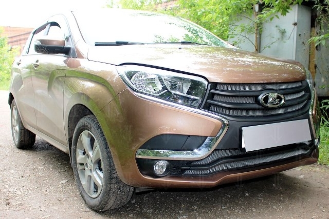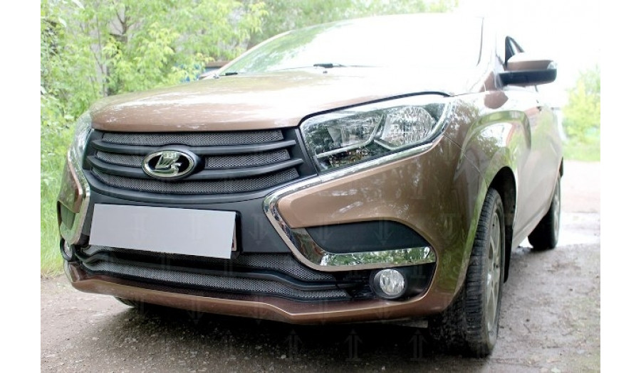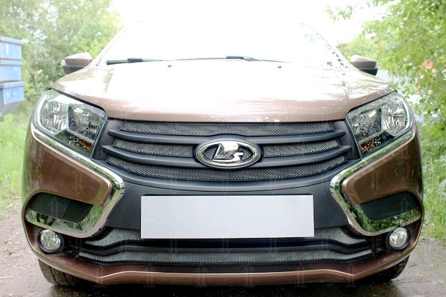 Нижняя защита радиатора из 2 частей для ЛАДА Иксрей изготовлена из алюминиевой сетки с размером ячейки 3*7 мм. Со стандартным, ромбовидным рисунком. Защищает радиатор автомобиля от попадания в него небольших камней, насекомых и прочего мелкого мусора, не препятствуя потокам воздуха (без ущерба для охлаждения двигателя).