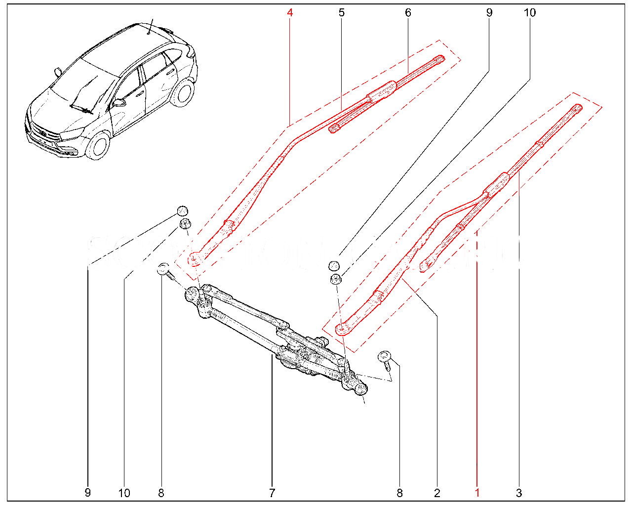Рычаг стеклоочистителя (поводок) и щетка (дворник) в сборе для Лада Иксрей.