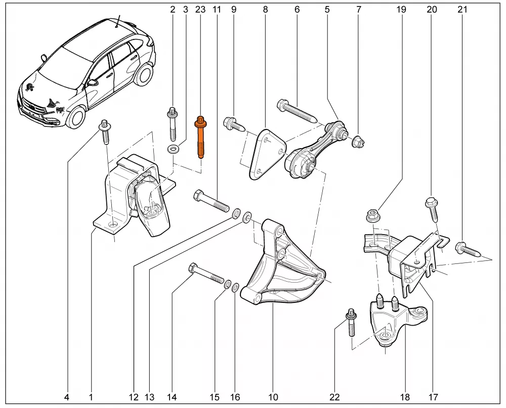 Болт крепит кронштейн правой опоры двигателя (под номером 23 на схеме).