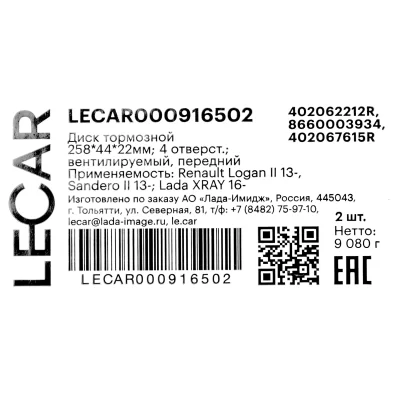 Диск тормозной передний; 258*44*22мм; 4 отверст.; вентилируемый / Renault Logan (II) 13-, Sandero (II) 14-, Clio (IV) 12-.